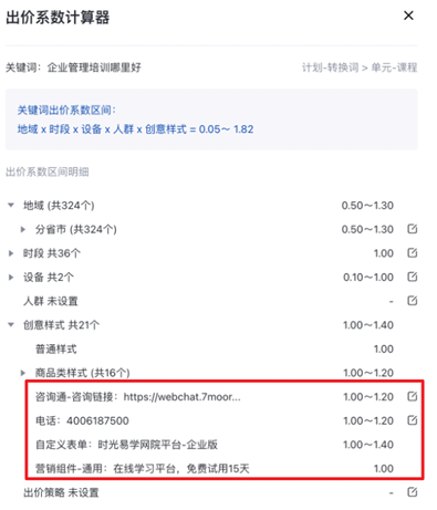 3、搜索推廣投放平臺(tái)(www2.baidu.com)-出價(jià)系數(shù)計(jì)算器中將不再展示營(yíng)銷類組件的出價(jià)系數(shù)(見下圖示意)